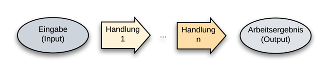 Knuppertz (2015, S. 35) ersetzt den Begriff der Tätigkeit durch eine Aktivität und versteht unter einem Prozess eine „wiederkehrende[.] Abfolge von verbundenen Aktivitäten, die aus einem definierten Input ein definiertes Arbeitsergebnis (Output) erzeugen“. Da eine Aktivität einer Handlung gleichgesetzt werden kann (Dudenredaktion, 2023a), lässt sich hieraus und in Anlehnung an die DIN EN ISO 9001:2015-11 (2015, S. 12) folgende Prozessabbildung konstruieren, innerhalb derer auf eine Eingabe (Input) mehrere Handlungen (Anzahl n) in Folge zu einem Arbeitsergebnis führen: