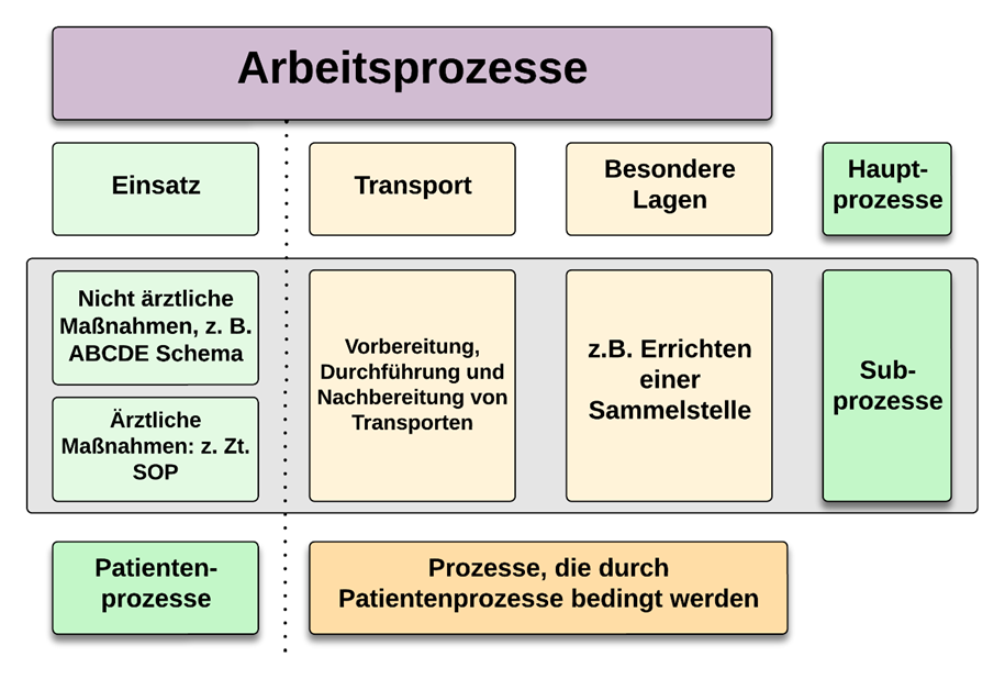 Müller et al. (2020, S. 3–4) bezeichnen das „Handeln im Rettungsdienst selbst als prozessorientiert“ und postulieren weiter, dass es „[…] für jeden erdenklichen Zustand [des Patienten, Anm. d. Autors] eine eigene Herangehensweise [gibt], die mehrere Handlungen miteinander vereint und dadurch entsprechende Subprozesse definiert“. Oben genannte Autoren beschäftigen sich mit der Berufsausbildung zum/zur Notfallsanitäter*in entlang von arbeitsprozessorientierten Lernaufgaben, deren Ergebnis ein Handlungsprodukt darstellt. Für den rettungsdienstlichen Bereich unterscheiden Gabriel et al. (2023) die Arbeitsprozesse in „Patientenprozesse (jegliche Arbeitsprozesse, die in direktem Zusammenhang mit dem Patienten stehen)“ und „Prozesse, die durch Patientenprozesse bedingt werden“. Ein auf die Patientenprozesse farblich abgestimmtes Modell der Prozessorientierung im Rettungsdienst nach obigen Autoren stellt sich wie folgt dar: